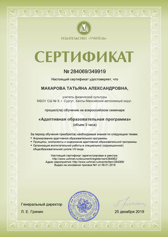05 декабря 2018 года - закончила Сургутский государственный педагогический университет, факультет физической культуры и спорта по специальности: 44.04.01 «педагогическое образование» направление: Теория физической культуры и технологий физического воспитания